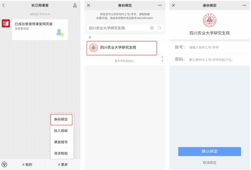 (2)点击公众号底部【更多】-【身份绑定】,搜索并选择“四川农业大学研究生院”进入绑定页面;