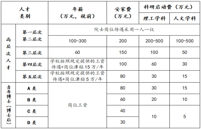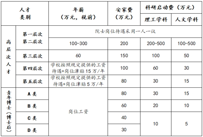| 购房补贴 | 生活补贴 | 周转住房 | 配偶工作安排 | 子女入学 | 职称晋升 | 科研奖励 经费配套 |