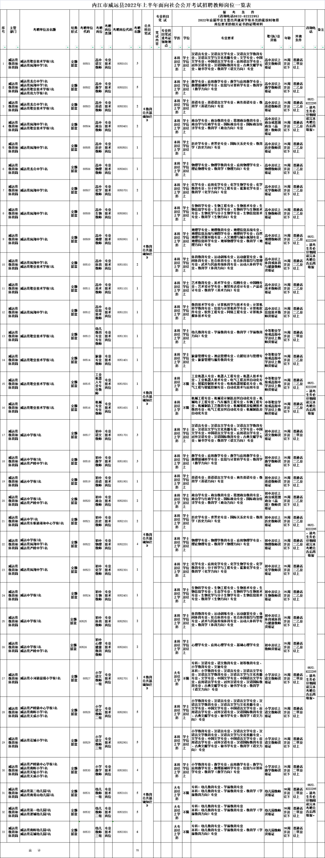 根据《事业单位人事管理条例》、《四川省事业单位工作人员招聘工作试行办法》(川人发〔2006〕9号)、《关于进一步规范事业单位公开招聘工作的通知》(川人社发〔2011〕36号)、《事业单位公开招聘违纪违规行为处理规定》(人力资源和社会保障部令第35号) 及《事业单位人事管理回避规定》(人社部规〔2019〕1号)等法规文件规定,按照“公开、平等、竞争、择优”原则,威远县2022年上半年拟面向社会公开考试招聘(以下简称“考聘”)教师78名。现将有关事项公告如下: