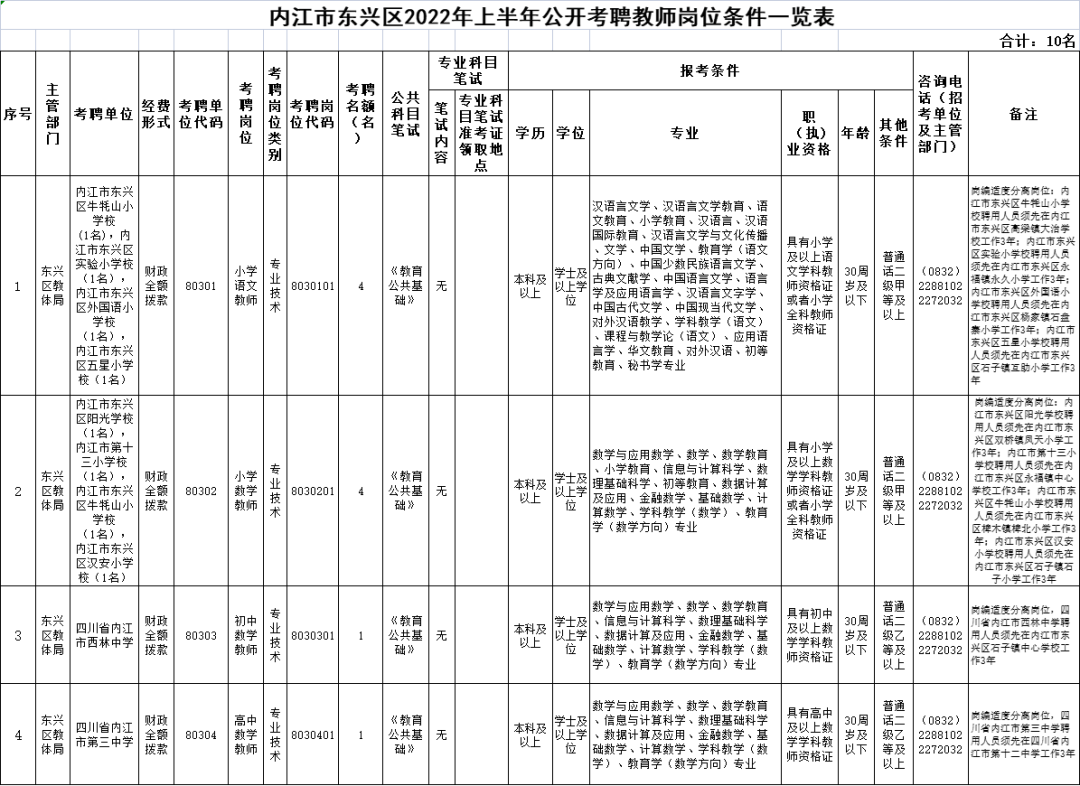 根据《事业单位人事管理条例》、《四川省事业单位工作人员招聘工作试行办法》(川人发〔2006〕9号)、《关于进一步规范事业单位公开招聘工作的通知》(川人社发〔2011〕36号)及《事业单位公开招聘违纪违规行为处理规定》(人力资源和社会保障部令第35号)等法规文件规定,按照“公开、平等、竞争、择优”的原则,2022年上半年内江市东兴区将面向社会公开考试招聘教育系统教师10名,现将有关事项集中公告如下:
