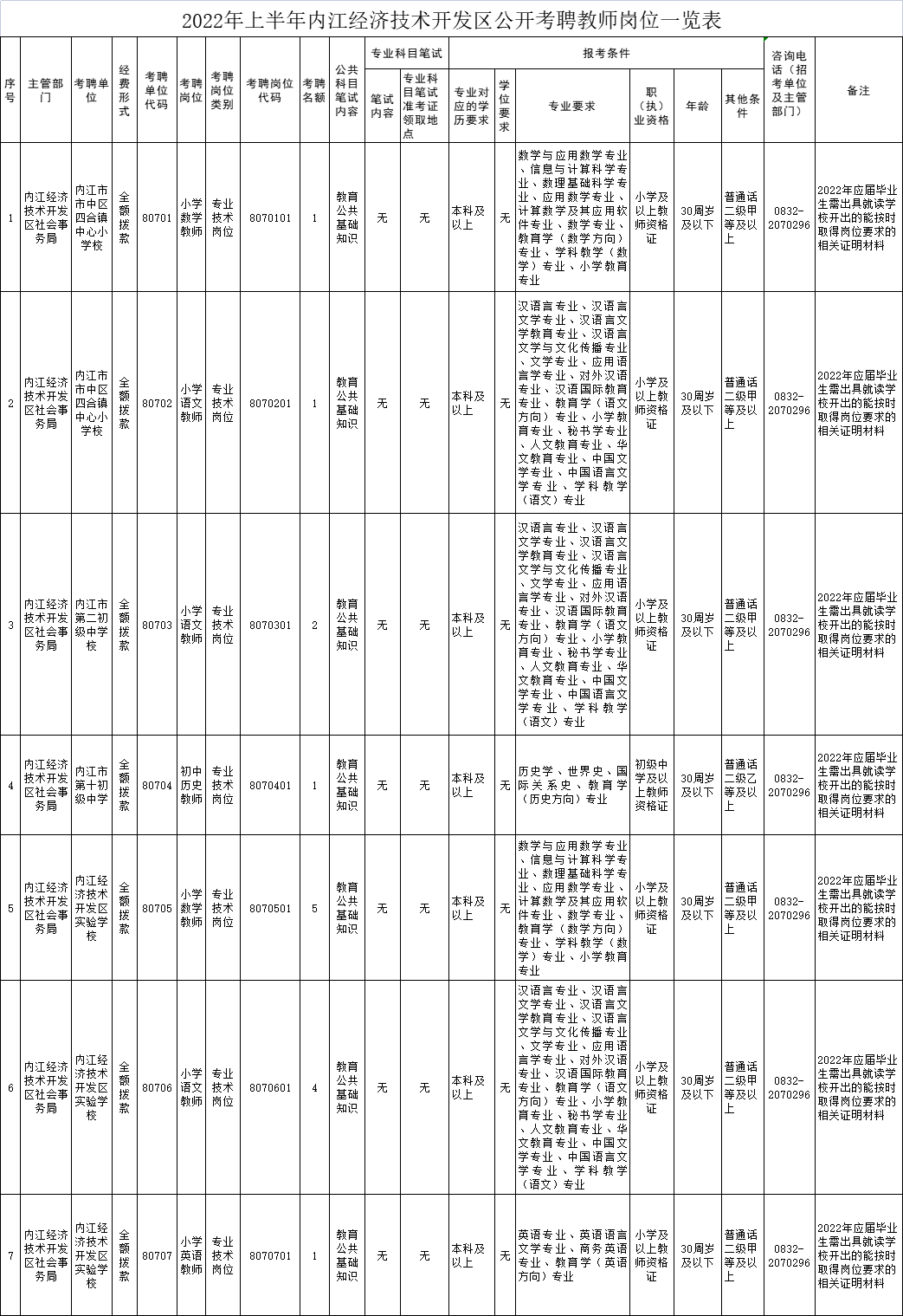 根据《事业单位人事管理条例》《四川省事业单位工作人员招聘工作试行办法》(川人发〔2006〕9号)《关于进一步规范事业单位公开招聘工作的通知》(川人社发〔2011〕36号)及《事业单位公开招聘违纪违规行为处理规定》(人力资源和社会保障部令第35号)等法规文件规定,按照公开、平等、竞争、择优原则,2022年上半年内江市市本级部分市直学校将面向社会公开考试招聘中小学教师18名。经汇总各考聘单位及主管部门意见后,现将有关事项集中公告如下: