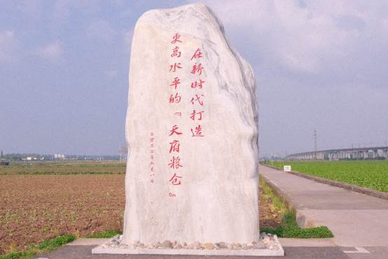 沿着田间小道向前,一块静静伫立的石碑进入师生视野。这块石碑形似大米,碑面书写着十五个鲜红遒劲的大字——“在新时代打造更高水平的天府粮仓。”这是去年6月8日习近平总书记考察永丰村时留下的殷切嘱托,也是永丰村牢记在心头的使命。杨永刚进一步介绍,为了谨记总书记的嘱托与厚望,大家特地把石碑修筑为4.6米高,寓意四季顺和与永远丰收。石碑前,师生们纷纷驻足,凝望碑上“嘱托”,用心领会总书记关于“严守耕地红线 抓紧抓牢粮食生产”重要指示。