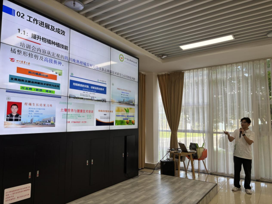交流会上,蒲江果业科技小院流动党支部常务副书记熊博重点介绍在科技小院成立流动党支部的创新实践,强调其作为推进党建与科研深度融合、打造青年党员践行强农兴农使命的重要育人平台作用。蒲江果业科技小院流动党支部研究生代表金铮华系统汇报科技小院服务地方产业的显著成效:自2019年成立以来,累计组织技术培训190余场,惠及果农超1.3万人次;推广“两个替代”技术使当地柑橘绿色防控覆盖率达65%,化肥用量减少20%;引进优新柑橘品种40个,并在砧穗互作、柠檬保鲜、裂果防治等关键技术领域取得突破性进展,显著提升产业韧性与农民收入。