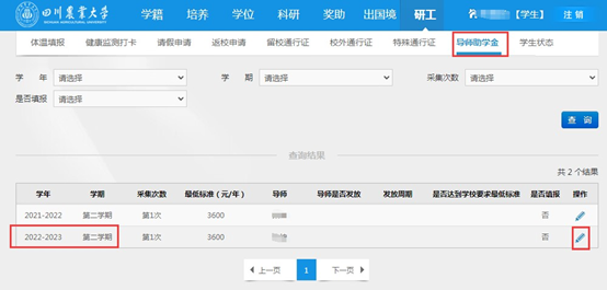 在读研究生均可在系统开放期间登录研究生管理系统-研工-导师助学金模块进行导师奖(助)学金发放信息的采集登记,务必保证反馈信息的真实性和准确性。