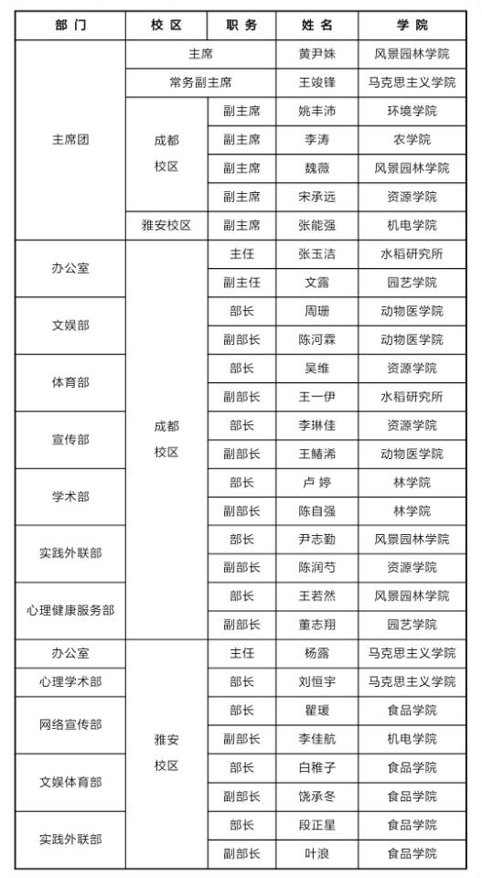 经个人申报,公开答辩,民主评议,校研究生会换届工作筹备小组慎重考察,党委研究生工作部审查通过,现将校研究生会第十三届委员会干部调整结果公示如下:
