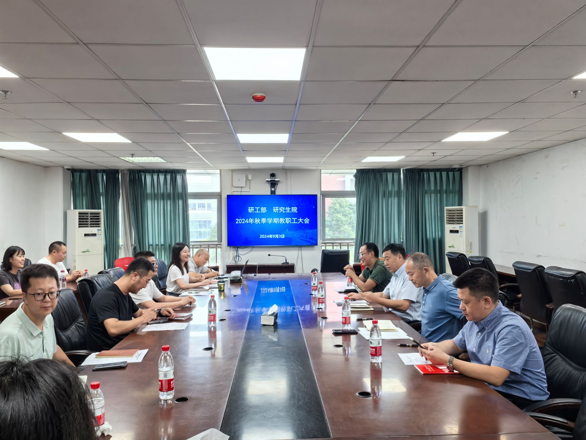 9月3日下午,研工部、研究生院在1教403会议室召开全体教职工大会,深入学习贯彻落实党的二十届三中全会精神,传达学习党委中心组(扩大)暨中层领导干部会议精神,谋划全面深化研究生教育改革,部署新学期研究生院重点工作。会议由研究生院院长李廷轩主持。