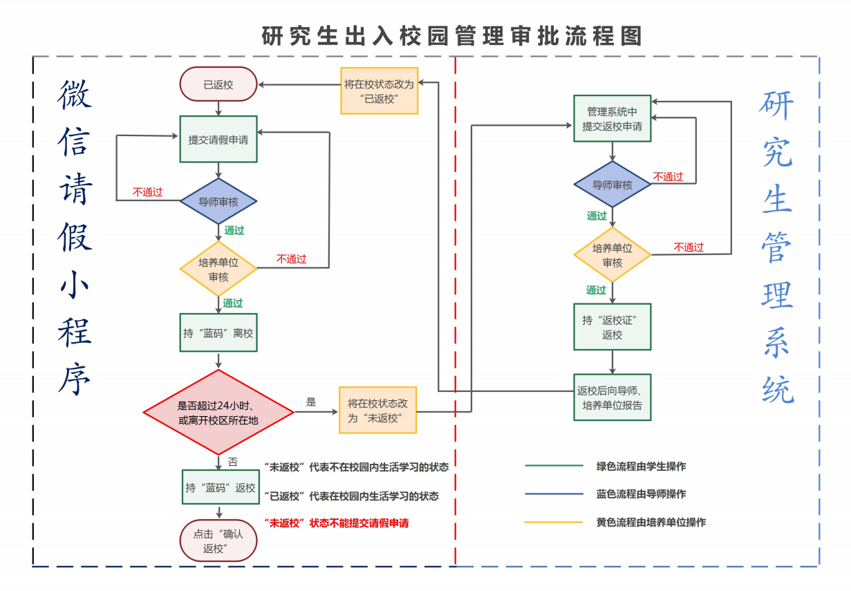 1.离校审批:在微信“研究生请假小程序”审核通过发放蓝色通行码,培养单位还应在确定学生已离开校园后将该生的在校状态设置为“未返校”。