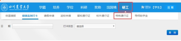 二、校内住宿的,因新老校区间或校区与基地间通勤等客观原因需频繁出入校园的研究生,可向培养单位申请开通“研究生特殊通行证”。开通后,申请者点击“特殊通行证”即可生成“研究生特殊通行证”。